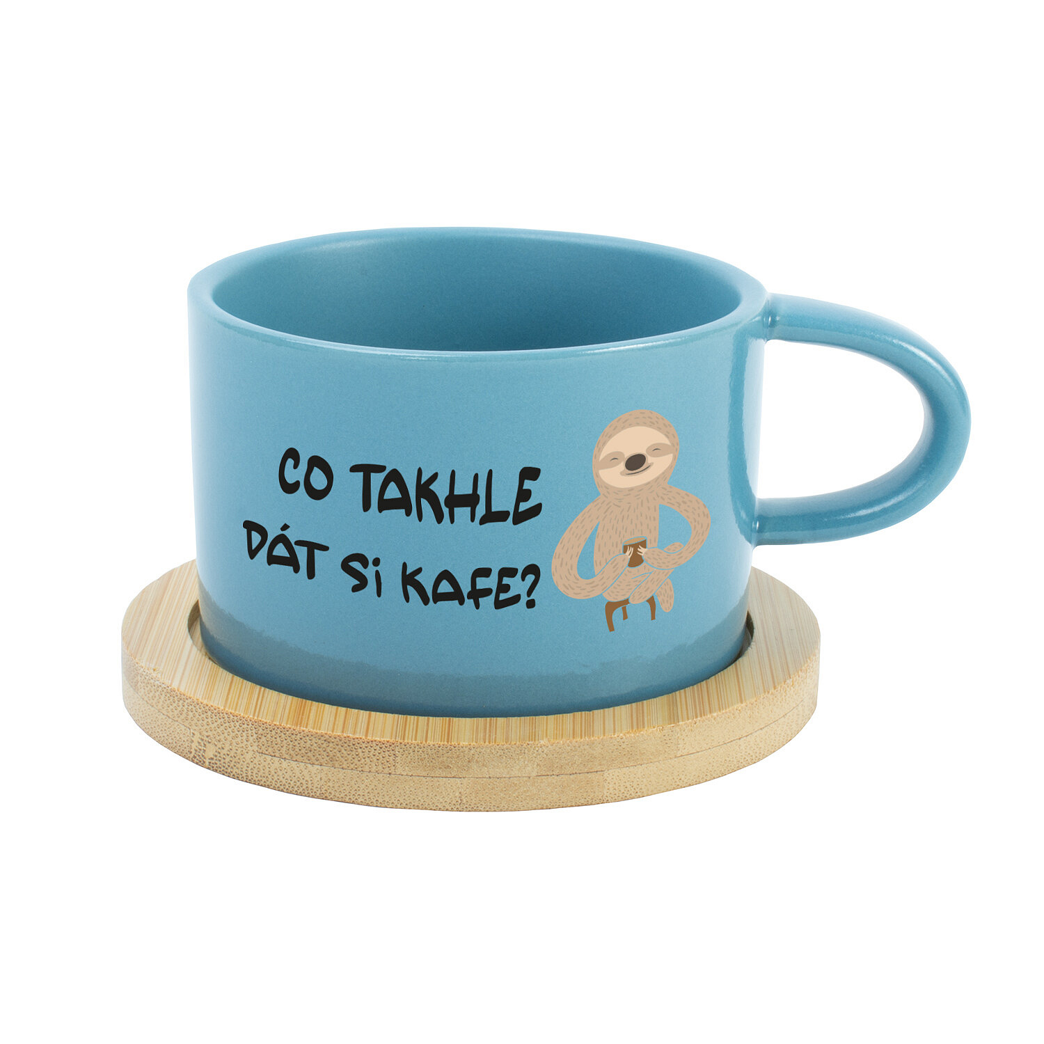Keramický hrneček s bambusovým podtáckem – Co takhle dát si kafe? Keramický hrneček s potiskem „Co Více