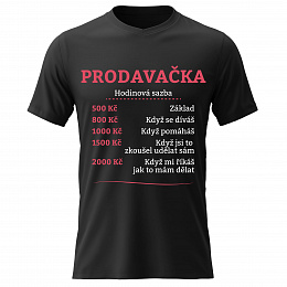 Akční nabídky na váš e-mailVtipné tričko s potiskem HODINOVÁ SAZBA PRODAVAČKA – styl s nadhledem