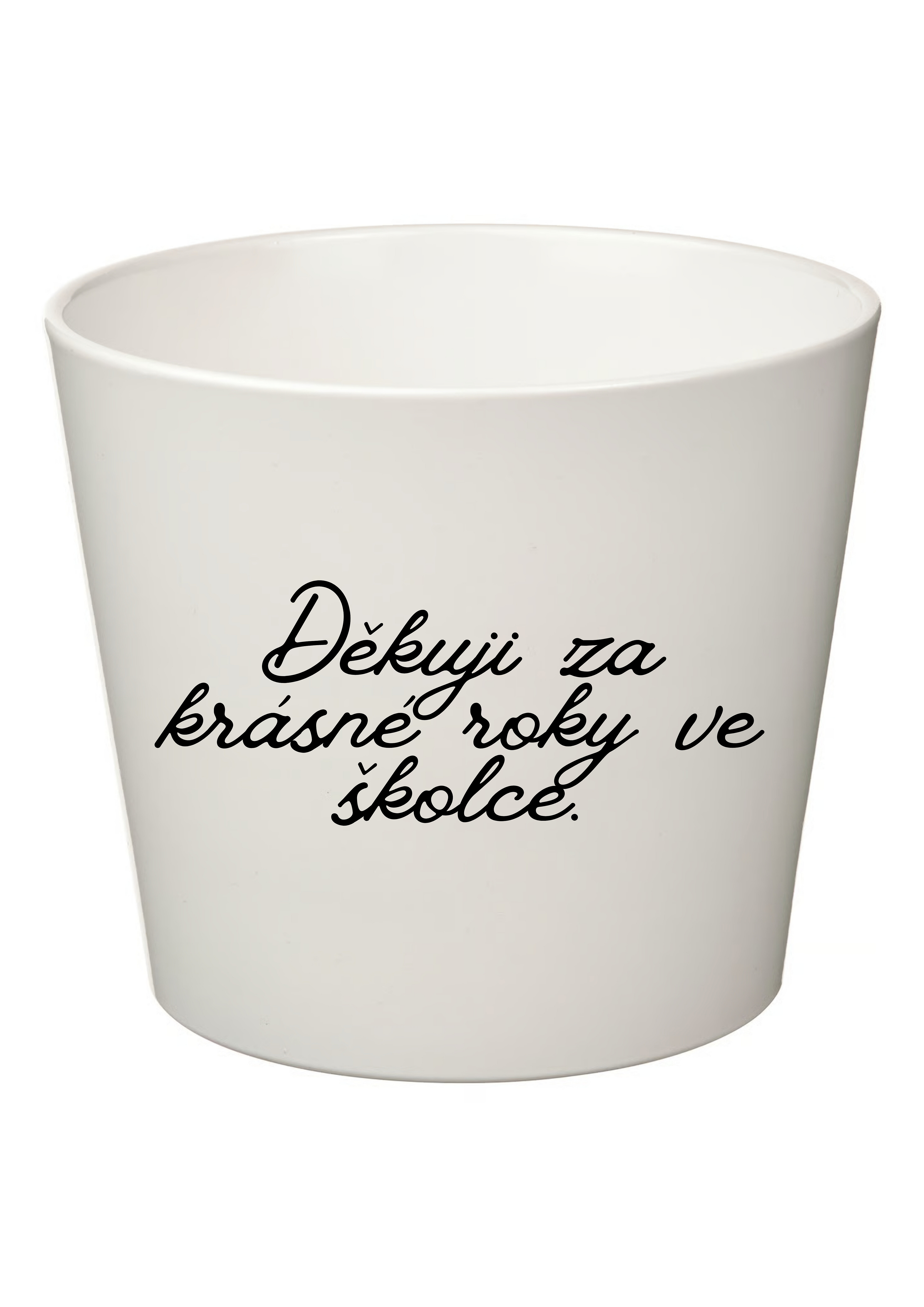 Květináč s milým poděkováním „Děkuji za krásné roky ve školce!“ je krásným a originálním dárkem pro paní učitelku na rozloučenou. Tento elegantní bílý květináč potěší nejen svým designem, ale i praktickým využitím – skvěle se hodí na menší pokojové rostliny nebo bylinky.