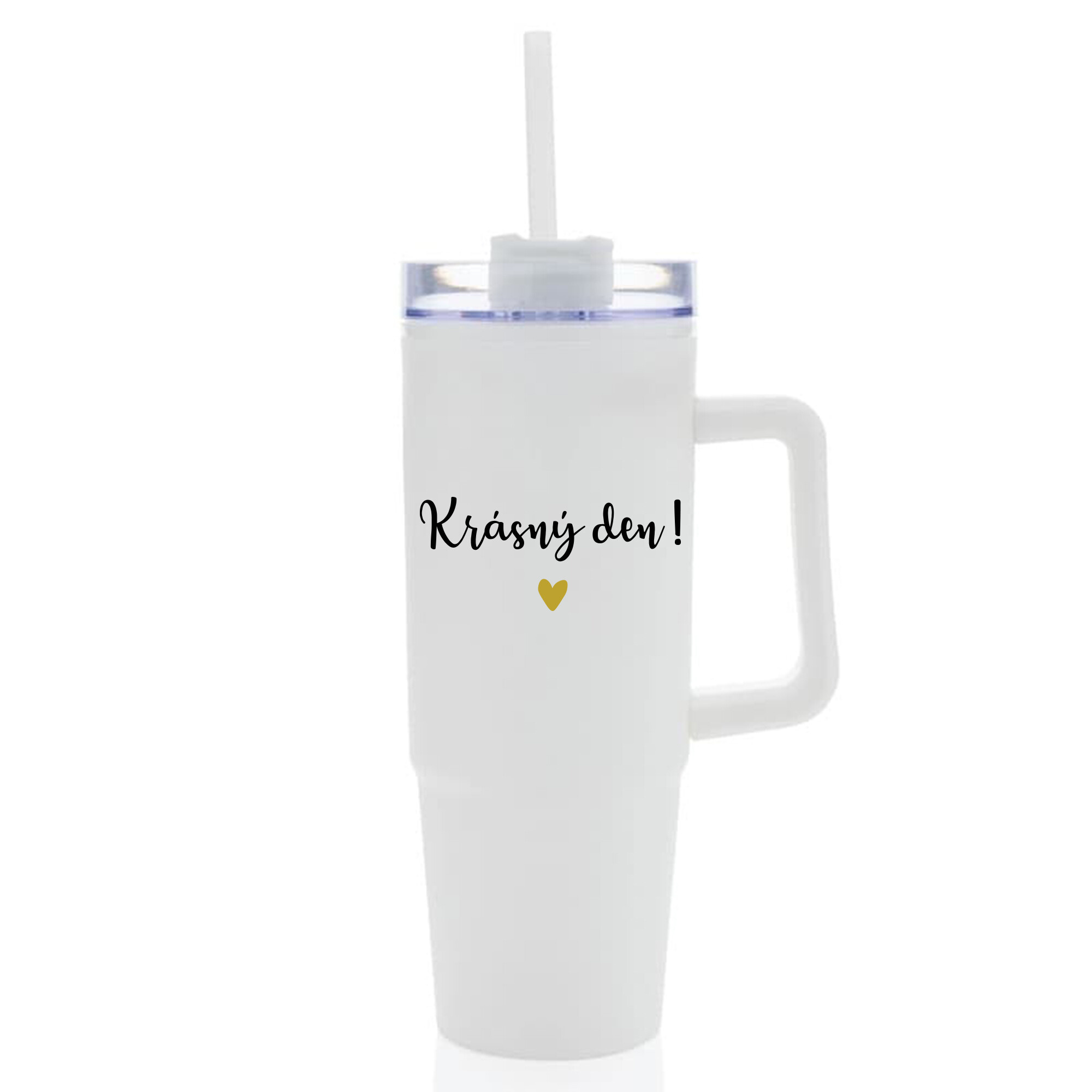 KRÁSNÝ DEN - bílý cestovní termohrnek s průhledným víčkem 900 ml