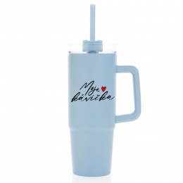 Popis MOJE KÁVIČKA - světle modrý cestovní termohrnek s průhledným víčkem 900 ml