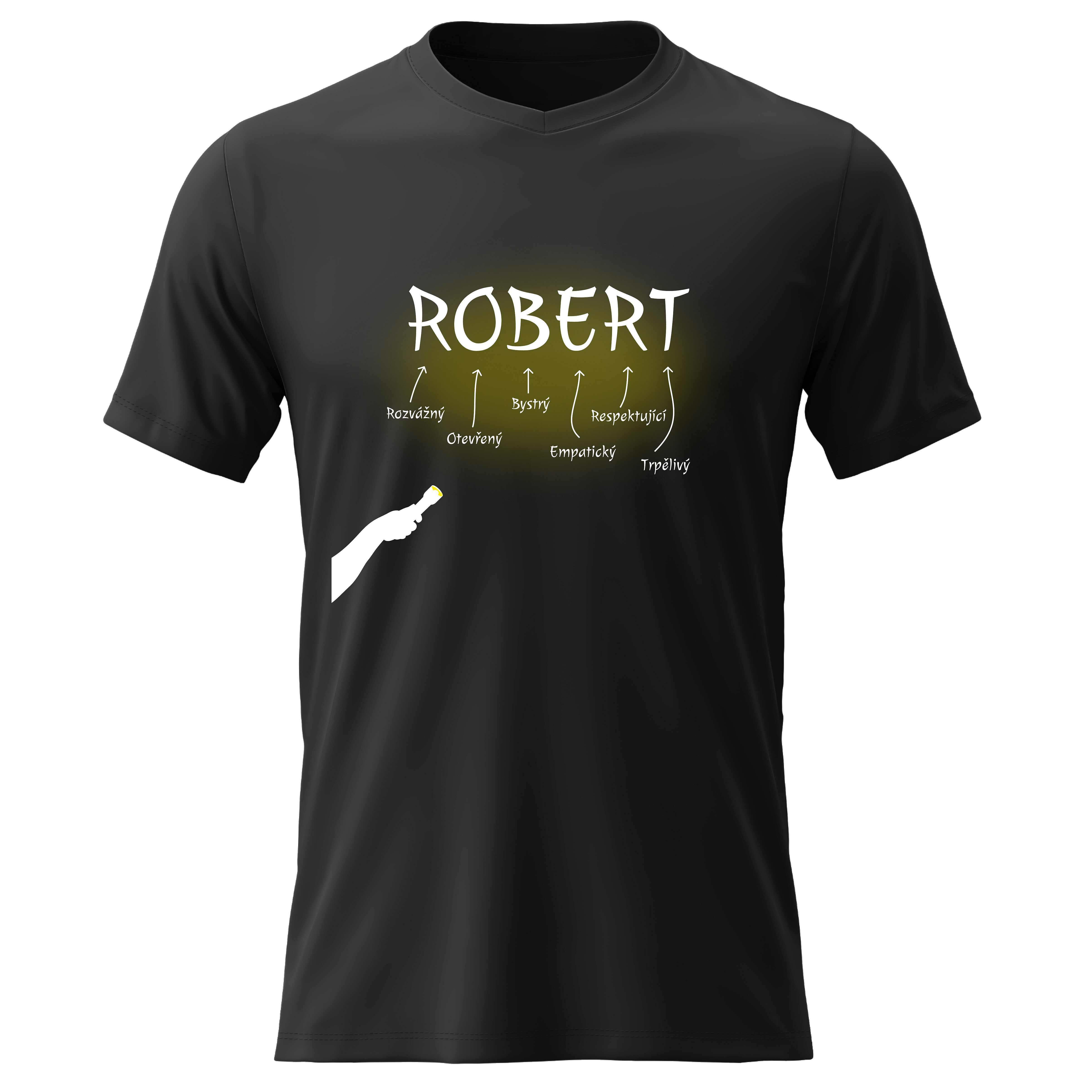 Akční nabídky na váš e-mailVtipné tričko s potiskem VLASTNOSTI - ROBERT – styl s nadhledem