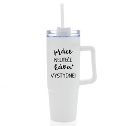 PRÁCE NEUTEČE, KÁVA VYSTYDNE! - bílý cestovní termohrnek s průhledným víčkem 900 ml