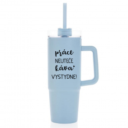 PRÁCE NEUTEČE, KÁVA VYSTYDNE! - světle modrý cestovní termohrnek s průhledným víčkem 900 ml
