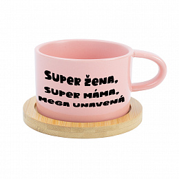 Keramický hrneček „Makronka“ s bambusovým podtáckem – Super žena, super máma, mega unavená Stylový Více