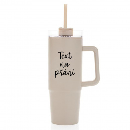 Popis TEXT NA PŘÁNÍ - béžový cestovní termohrnek s průhledným víčkem 900 ml